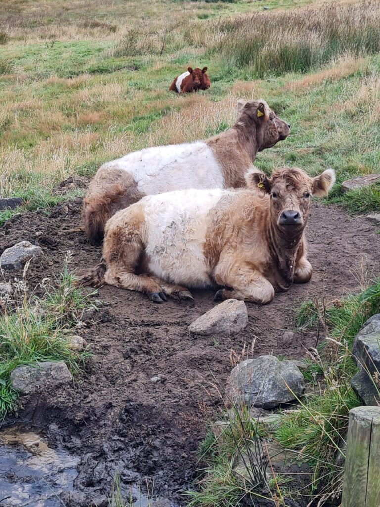 Our growing herd of Belted Galloway can often be seen grazing in our rougher intakes something which they thrive on and allows us to utilise all our land efficiently. We have a range of colours from black, red and dun with their white belts around their middles this make them stand out to passers by and in bleak winters in bad weather.